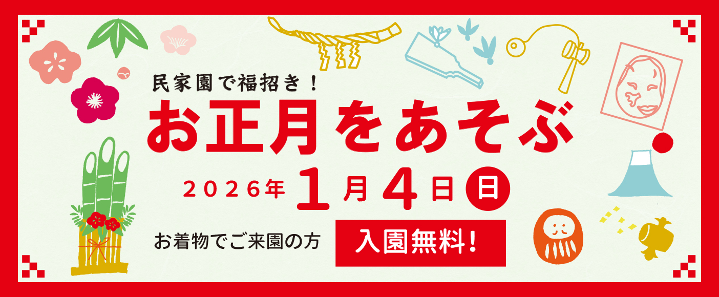 2025年12月17日 本日の開園時間9:30~16:30(入園は16:00まで) 本日のイベント 年中行事展示「正月準備」詳しくはこちらから年中行事展示「恵比寿講」詳しくはこちらから伝統工芸館ミニ展示「干支2026ー午・うまー」干支の型染め作品展詳しくはこちらから特別展示「雪囲い-旧菅原家-」詳しくはこちらから企画展「五箇山で暮らす―世界遺産登録30周年特別展―」10月1日~5月24日詳しくはこちらから アクセス ご利用案内・料金 お知らせ 2025年12月09日 1月17日開催、藍染めワークショップ「大きな布を染める」受付中 2025年12月04日 年末年始のお休みについて 2025年12月02日 1月11日開催、ベーゴマ大会「第33回民家園杯」について 2025年11月26日 ボランティア団体「炉端の会」の年末年始の活動について 2025年11月12日 12月20日開催、「正月のお花と日本の歳時記」の申込について 2025年08月30日 園内の工事について 2025年07月29日 学校利用に関するお知らせ 2025年06月11日 令和7年度体験学習受入れ(令和7年9月~令和8年3月)抽選結果 2025年05月15日 令和7年度博物館実習生募集要項(Ⅱ期追加)について 2025年03月15日 「令和7年度 学校利用募集要項」について もっと見る イベントカレンダー PREV2025年 12月NEXT日月火水木金土30123456企画展「五箇山で暮らす―世界遺産登録30周年特別展―」10月1日~5月24日企画展「五箇山で暮らす―世界遺産登録30周年特別展―」10月1日~5月24日むかし話「万華鏡のむかし話」特別展示「雪囲い-旧菅原家-」特別展示「雪囲い-旧菅原家-」年中行事展示「事八日」年中行事展示「事八日」伝統工芸館ミニ展示「干支2026ー午・うまー」干支の型染め作品展伝統工芸館ミニ展示「干支2026ー午・うまー」干支の型染め作品展年中行事展示「恵比寿講」年中行事展示「正月準備」藍染めワークショップ「ストール染めⅠ」藍染めワークショップ「ストール染めⅡ」78910111213企画展「五箇山で暮らす―世界遺産登録30周年特別展―」10月1日~5月24日企画展「五箇山で暮らす―世界遺産登録30周年特別展―」10月1日~5月24日特別展示「雪囲い-旧菅原家-」特別展示「雪囲い-旧菅原家-」年中行事展示「事八日」年中行事展示「事八日」伝統工芸館ミニ展示「干支2026ー午・うまー」干支の型染め作品展伝統工芸館ミニ展示「干支2026ー午・うまー」干支の型染め作品展年中行事展示「恵比寿講」年中行事展示「恵比寿講」年中行事展示「正月準備」年中行事展示「正月準備」企画展示解説(子ども向け)むかし話「遠野の語り」民家園ワークショップ「糸かけ「鳳凰」」12月13日14151617181920企画展「五箇山で暮らす―世界遺産登録30周年特別展―」10月1日~5月24日企画展「五箇山で暮らす―世界遺産登録30周年特別展―」10月1日~5月24日古民家めぐり(暮らし)10月25日、11月22日、12月20日特別展示「雪囲い-旧菅原家-」特別展示「雪囲い-旧菅原家-」伝統工芸館ミニ展示「干支2026ー午・うまー」干支の型染め作品展伝統工芸館ミニ展示「干支2026ー午・うまー」干支の型染め作品展年中行事展示「恵比寿講」年中行事展示「恵比寿講」年中行事展示「正月準備」年中行事展示「正月準備」むかし話「お国言葉で語りっこ」民家園ワークショップ「正月のお花と日本の歳時記」21222324252627企画展「五箇山で暮らす―世界遺産登録30周年特別展―」10月1日~5月24日企画展「五箇山で暮らす―世界遺産登録30周年特別展―」10月1日~5月24日特別展示「雪囲い-旧菅原家-」特別展示「雪囲い-旧菅原家-」伝統工芸館ミニ展示「干支2026ー午・うまー」干支の型染め作品展伝統工芸館ミニ展示「干支2026ー午・うまー」干支の型染め作品展年中行事展示「恵比寿講」年中行事展示「恵比寿講」年中行事展示「正月準備」年中行事展示「正月準備」年中行事展示「正月飾り」体験講座 わら細工「しめ縄(たまかざり)」28293031123企画展「五箇山で暮らす―世界遺産登録30周年特別展―」10月1日~5月24日古民家めぐり(建築)10月19日、11月30日、12月28日特別展示「雪囲い-旧菅原家-」伝統工芸館ミニ展示「干支2026ー午・うまー」干支の型染め作品展年中行事展示「恵比寿講」年中行事展示「正月飾り」 休園日 X(Twitter) Tweets by KNihonminkaen 伝統工芸館 -カワサキ・ブルー- 「カワサキ・ブルーが生まれる場所へ」伝統工芸館の藍染め 藍染め体験 藍染め講座ワークショップ 学校利用について 学校体験 学校見学 民家園の資料集 おすすめコースほかPDF 民家園動画 民家園だよりバックナンバー 「みんかっぱ」の仲間たち 暮らしの中の言葉 民俗調査報告 収蔵品目録 出版物