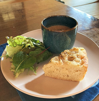 - 基本メニュー:つしま大石農園の和紅茶、古民家クッキー、スープとパンのセットなど