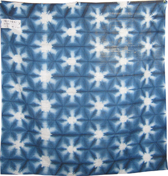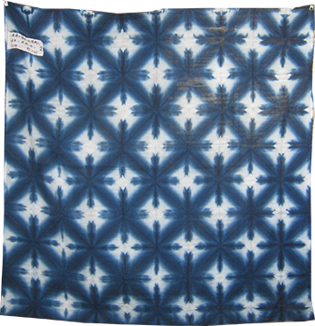 約110cm四方のダブルガーゼの生地を、紐や輪ゴムでくくったり板締めをして模様をつけ、藍で染め上げます。